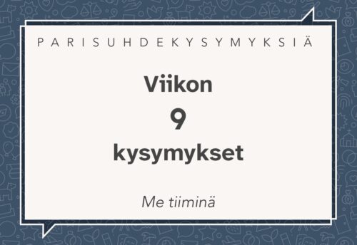 Tällä viikolla sukellamme syvemmälle yhteistyön maailmaan. Miten voimme parhaiten tukea ja täydentää toisiamme arjen haasteissa? Parisuhteen kysymyksiä viikolle 9, teemana “Me tiiminä”: Ma: Milloin hoidimme jonkun asian yhteistyössä erityisen hyvin? Mitä sinä teit ja mitä