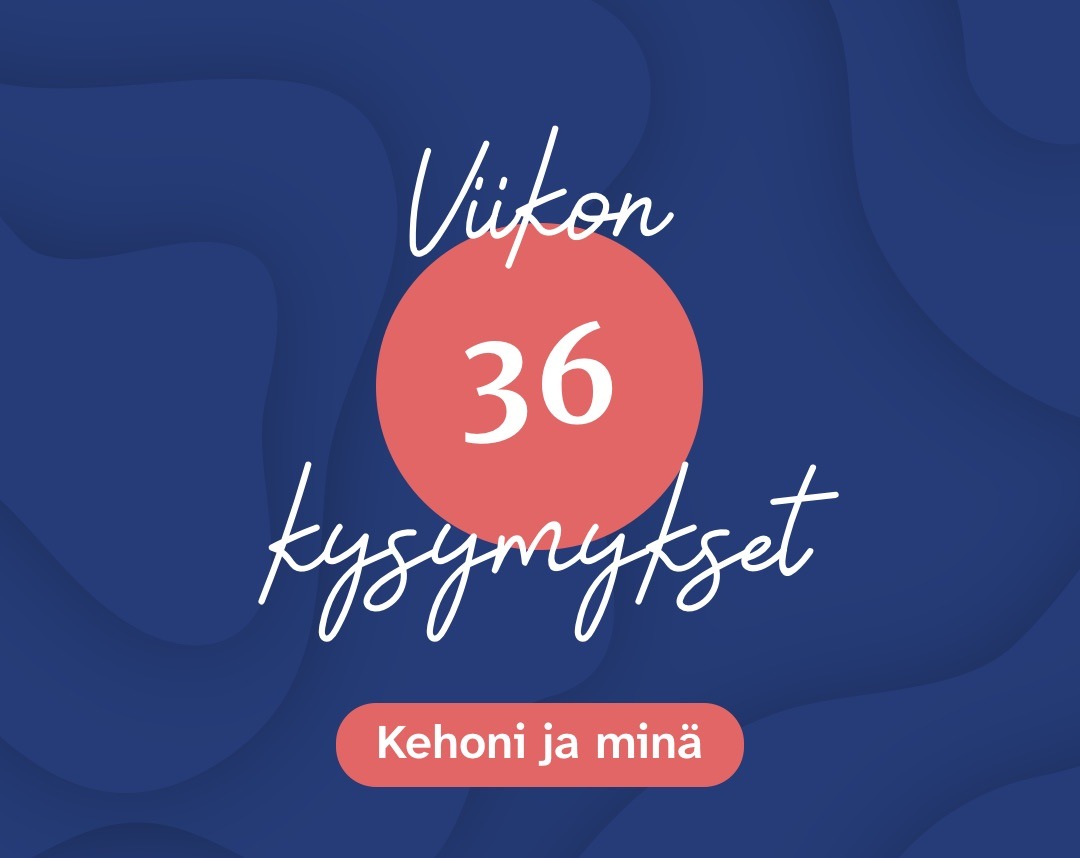 Kehomme on elämänkumppanimme, jonka tarpeet ja viestit ansaitsevat tulla kuulluiksi. Viikon aikana voimme oppia tuntemaan itseämme ja kumppaniamme paremmin, kun pysähdymme kuuntelemaan kehojemme kertomuksia ja tuntemuksia. Parisuhteen kysymyksiä viikolle 36, teemana “Kehoni ja minä”: Ma: